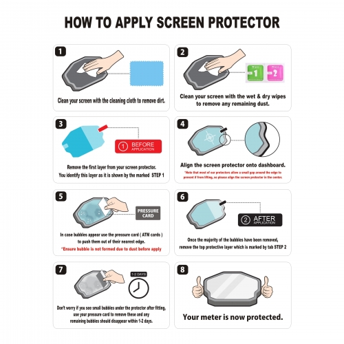 Caution : * While washing your motorcycle do not spray high pressure water on the dashboard once the screen protector is applied. * There would be chances of air bubbles forming and the screen protector could likely come off the display.